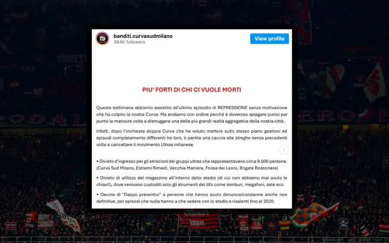 "Minggu ini kami menyaksikan episode terbaru dari REPRESSION tanpa pembenaran yang melanda Curva kami. Tapi mari kita lanjutkan secara berurutan karena perlu menjelaskan poin demi poin manuver yang bertujuan untuk menghancurkan salah satu realitas agregatif terbesar kota kita."
