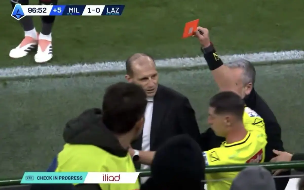 Ketika peninjauan VAR dimulai, Allegri tampaknya menganggap tendangan penalti akan diberikan setelah bola terlihat mengenai lengan Pavlovic. Sang pelatih pun melayangkan protes secara verbal yang tampaknya cukup keras sehingga wasit mengusirnya keluar lapangan dengan kartu merah.