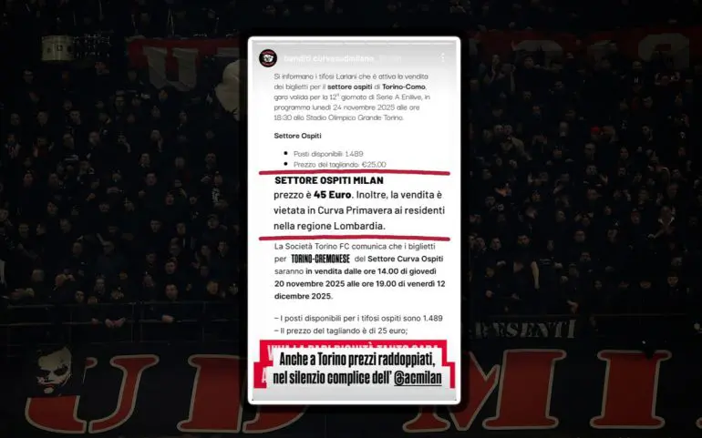 Sekarang Curva Sud membagikan cerita yang menunjukkan bahwa tiket sektor tandang untuk pertandingan melawan Torino dijual seharga €45. Sementara untuk pertandingan melawan Como dan Cremonese, Il Toro hanya mematok €25 sebagai harga tiket untuk para pendukung tim tamu, mereka menuliskan: "Harga telah naik berkali lipat di Turin, di tengah keheningan Milan yang terlibat."