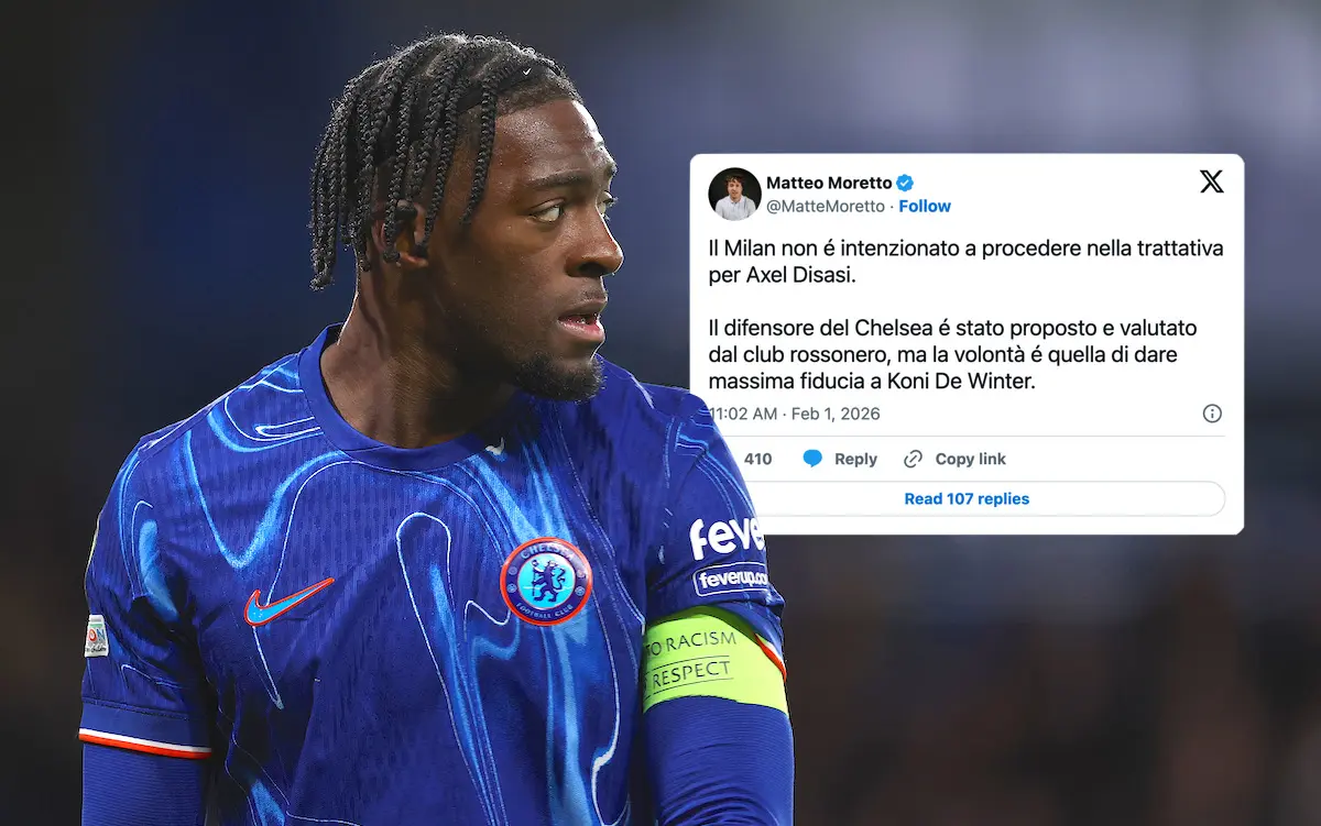 Namun sekarang Matteo Moretto justru melaporkan hal sebaliknya dengan menuliskan: "Milan tidak berniat untuk melanjutkan negosiasi untuk Axel Disasi. Bek Chelsea itu ditawarkan dan dievaluasi oleh Rossoneri, tetapi niatnya adalah untuk memberikan kepercayaan penuh kepada Koni De Winter."