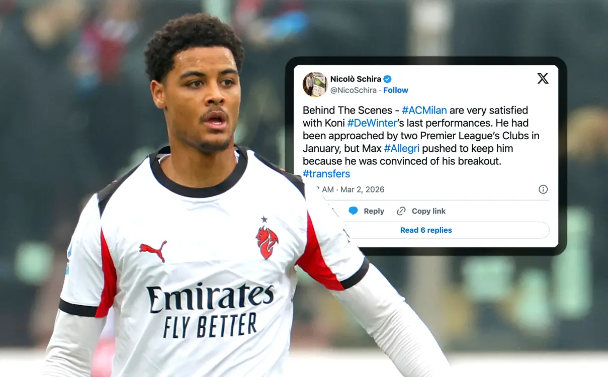 Nicolo Schira dari Tuttosport membagikan informasi terbaru terkait situasi De Winter dengan menuliskan: "Milan sangat puas dengan penampilan terakhir Koni De Winter. Dia telah didekati oleh dua tim Premier League pada bulan Januari, tetapi Max Allegri tegas mempertahankannya karena dia yakin sang bek akan membuat gebrakan."